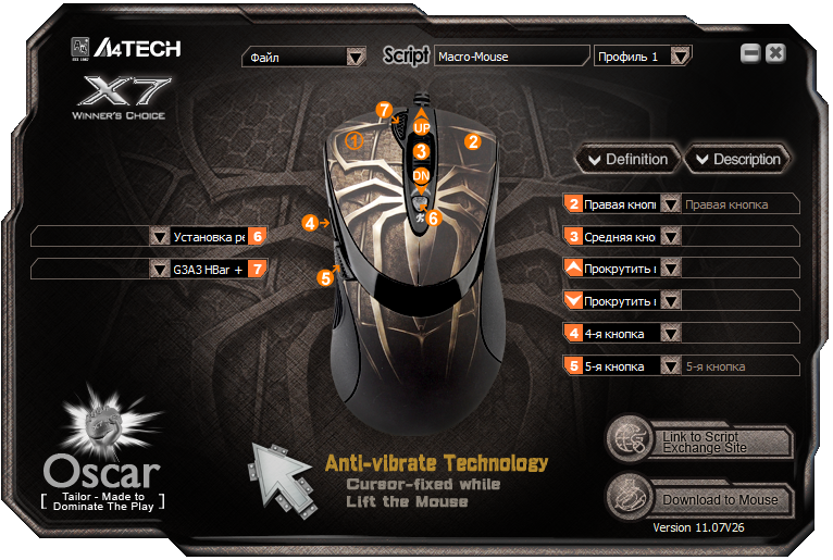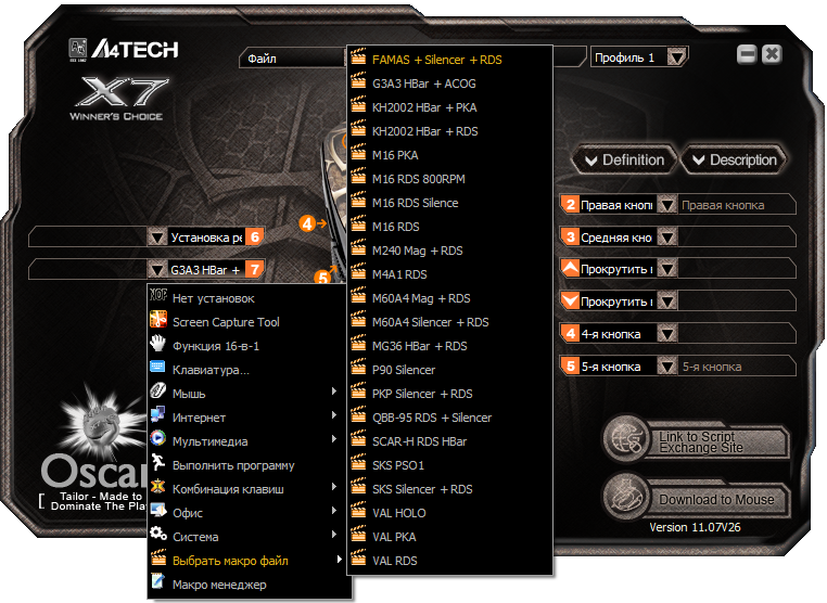 Все игроки знают, что G3A3 в игре обладает самой большой отдачей среди штурмовых винтовок и невозможно нормально стрелять очередями, состоящими из более чем 3х патронов потому, что ствол так и норовит уйти куда-нибудь в направлении потолка, но что мы видим на видео? Винтовка прекрасно бьет в одно место при стрельбе очередью из 20 патронов, вертикальной отдачи как таковой больше нет (при том, что сама винтовка укомплектована тяжелым стволом, который еще более увеличивает вертикальную отдачу). Как? - спросите вы. На самом деле все очень несложно, для начала необходимо скачать программу, которая предназначена специально для игровых мышек A4Tech X7 серии, называется она Oscar Editor, скачать можно http://www.x7.cn/oscaren/ (перед тем, как качать, убедитесь, что ваша X7 мышка обладает встроенной памятью). Скачали? - запускаем, вот так выглядит главное меню программы: